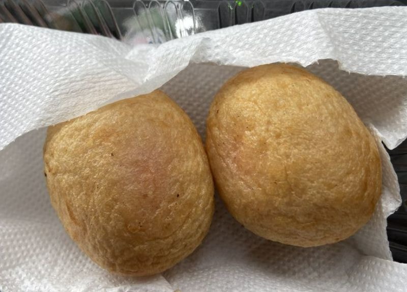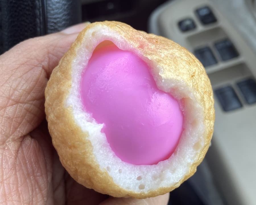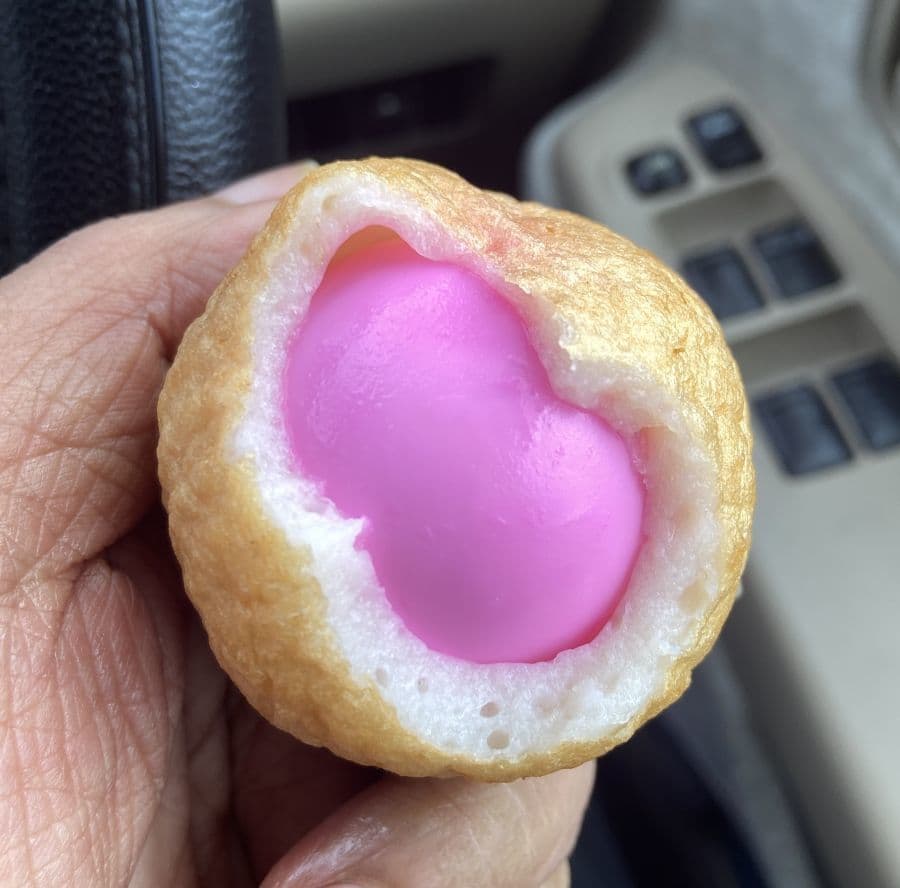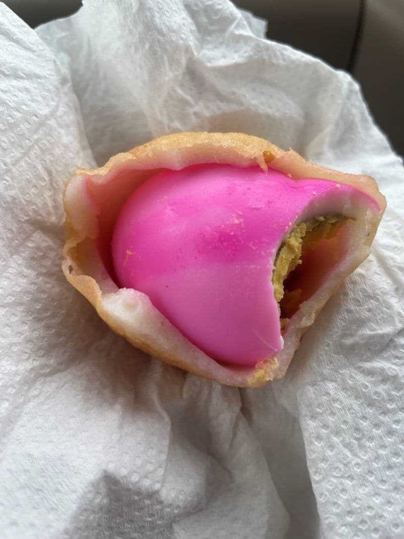 平戸の郷土料理の一つで卵入りの練り物で、食紅でゆで卵に色を付けているので切った断面がピンク色に縁どられるのが特徴とのこと。何んか縁起の良い練り物ですね。