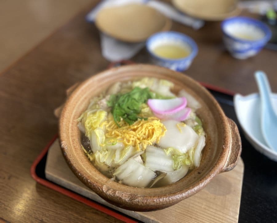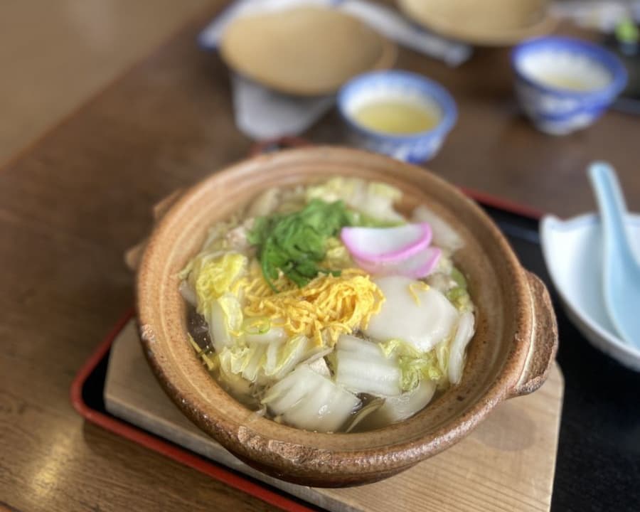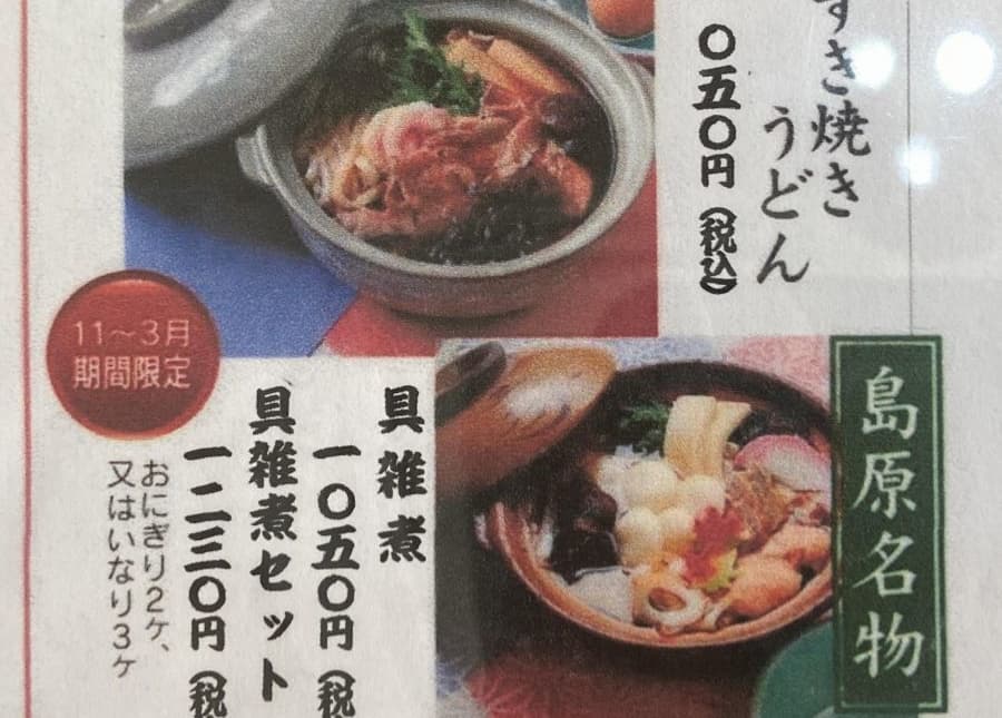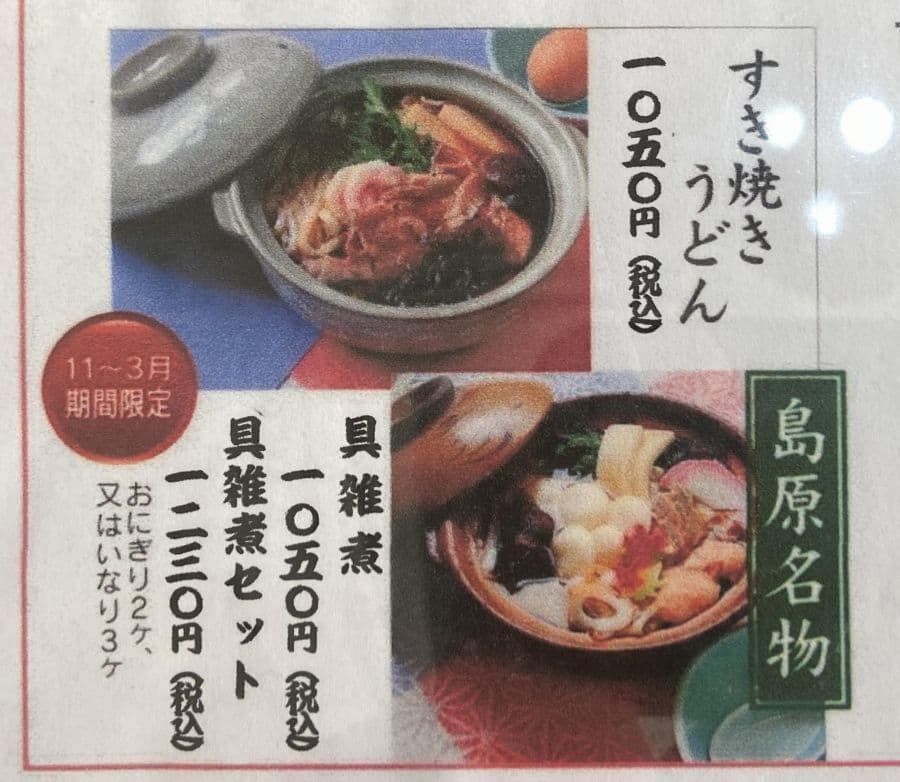 ここで大家さんゆかりの駅を訪ねたところで昼食タイム。長崎の友人推薦の島原市の有名店まではもたず、多比良駅近くで具雑煮の幟旗を見かけていたので急遽そちらへ。この判断が大当たり。
