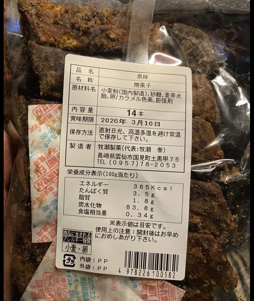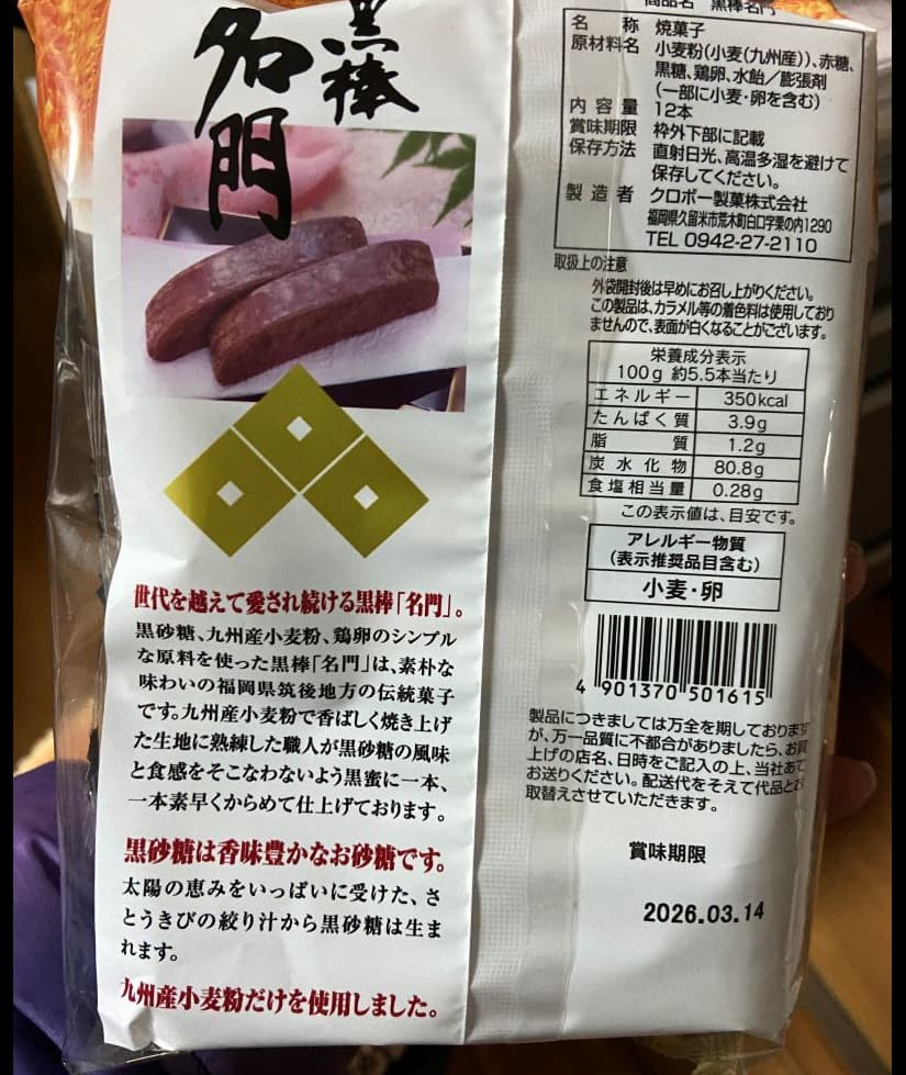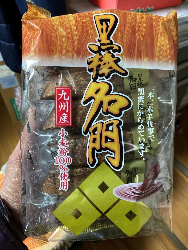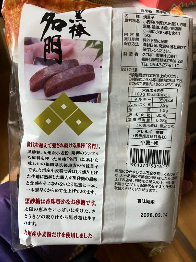 「黒棒 名門」は九州産の小麦粉仕様にこだわった、社名そのものがクロボーという久留米市のクロボー製菓(創業大正9年、1920年、株式会社日立製作所が設立された年でもありますね)さんの黒棒。近所のドン・キホーテで購入。